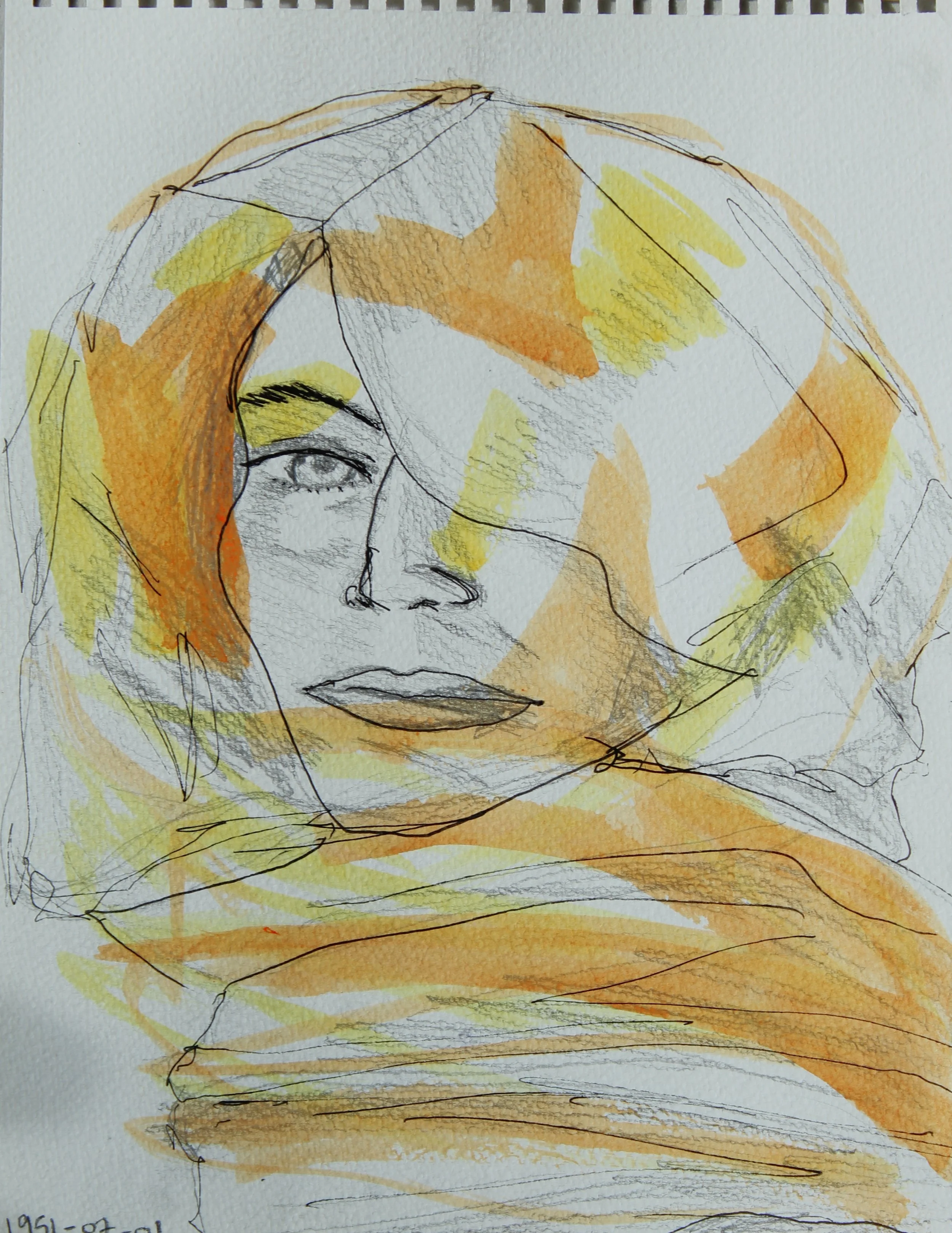Further developing the non-dominant hand drawings, I outlined using fineliner pens and added colour with orange and yellow ink.